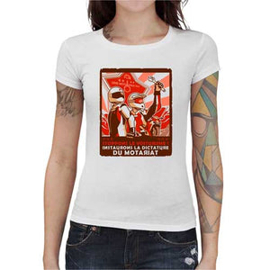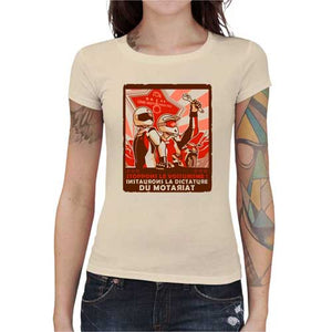 "Stoppons le voiturisme et imposons la dictature du motoriat !!". Un slogan détournant le bien connu : "Stoppons le capitalisme et instaurons la dictature du prolétariat". Pour représenter au mieux le message, nous nous sommes inspirés des vieilles affiches de propagande Soviétiques, au parfum vintage. Une moto pour tous et tous avec l'esprit motard ! Un tee-shirt très esthétique et original pour faire triompher l’idéologie du motoriat. On vous garantit que vous allez faire des adeptes !