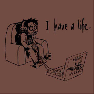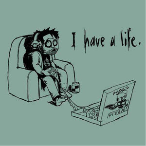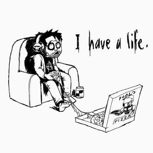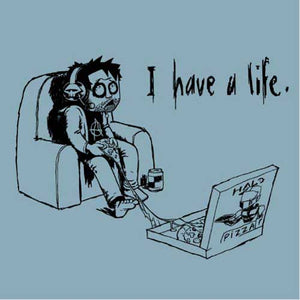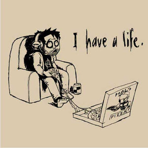 Comme l’illustre ce t-shirt, la vie d’un nerd est faite de plaisirs simples. Les jeux vidéo, bien sûr, et pas plus d’une dizaine d’heures par jour histoire d’être raisonnable. Une alimentation saine et équilibrée à base de pizzas et de plats à réchauffer vite fait au micro-ondes pour ne pas perdre une minute pendant une session online. Bien sûr que le nerd a une vie ! Jusqu’au game over, du moins... On notera sur la boîte à pizza le clin d'œil à Halo, saga culte de la Xbox. Un tee-shirt plein de second degré pour tous les accros au pad et au clavier !