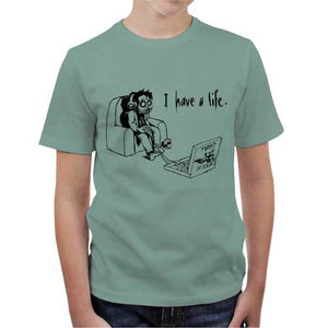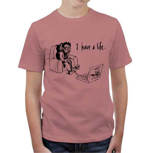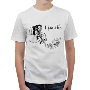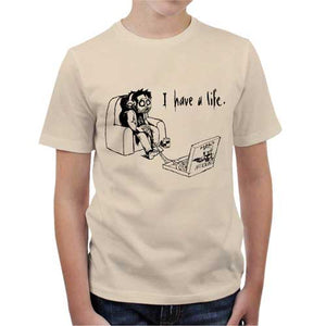 Comme l’illustre ce t-shirt, la vie d’un nerd est faite de plaisirs simples. Les jeux vidéo, bien sûr, et pas plus d’une dizaine d’heures par jour histoire d’être raisonnable. Une alimentation saine et équilibrée à base de pizzas et de plats à réchauffer vite fait au micro-ondes pour ne pas perdre une minute pendant une session online. Bien sûr que le nerd a une vie ! Jusqu’au game over, du moins... On notera sur la boîte à pizza le clin d'œil à Halo, saga culte de la Xbox. Un tee-shirt plein de second degré pour tous les accros au pad et au clavier !