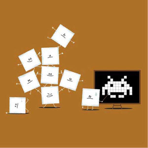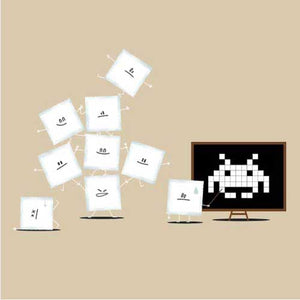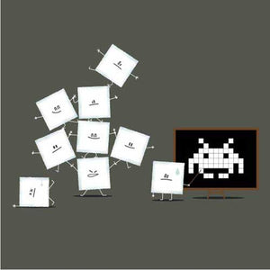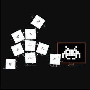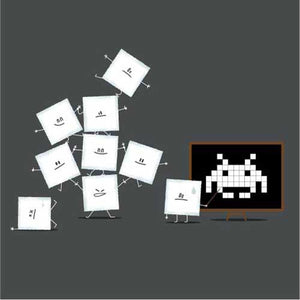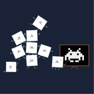 Le saviez-vous ? Pour former un sprite, c’est tout un programme ! Ce tee-shirt humoristique le montre bien, en coulisses les pixels doivent s’entraîner dur pour créer des combinaisons parfois complexes, histoire que le personnage ou l’élément affiché à l’écran soit parfaitement représenté. Ici, nul doute qu’il va falloir encore pas mal de boulot à ces pixels débutants pour former un Space Invader correct…