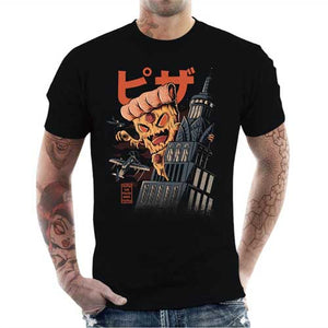 Vous ne saviez pas encore que vous rêviez de porter un tee-shirt montrant une part de pizza géante semant le chaos et la désolation ? Voilà qui est fait ! Repoussant toujours plus loin les limites de l’originalité et de la parodie, Checkpoint vous propose ce modèle aussi stylé qu’hilarant, clin d'œil au monument du septième art qu’est King Kong. Bourré de charme, avec cette touche rétro propre à l’époque, et rendant en même temps hommage aux films de monstres japonais, ce t-shirt irrésistible est déjà un classique pour geeks et cinéphiles !