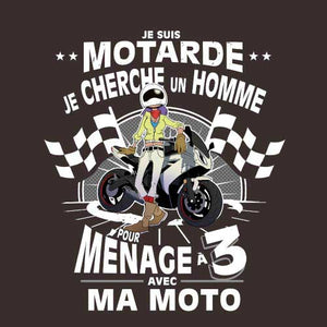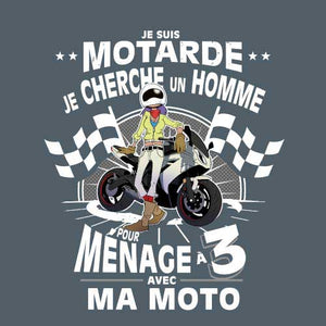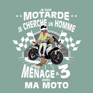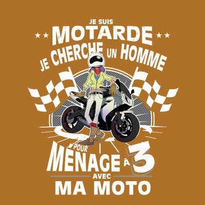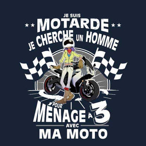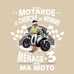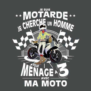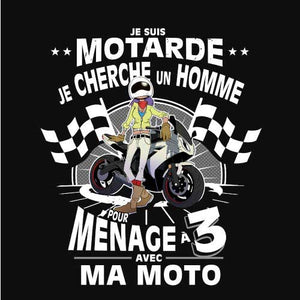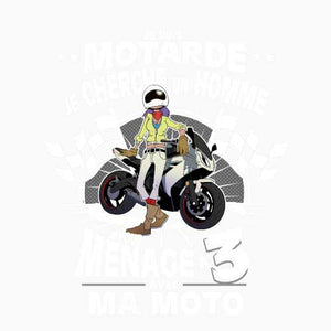 Tout femme motarde célibataire se doit de poser quelques conditions d’emblée. Parmi l’une d’elles, et c’est sans doute la plus essentielle, il faudra que l’heureux élu accepte de faire un ménage à trois ! Mais que ces messieurs calment leurs ardeurs d’emblée, ce n’est pas avec une autre femme qu’il partagera le foyer, mais avec une moto ! S’il n’y voit aucun inconvénient, il pourrait bien avoir marqué des points... Un tee-shirt bourré d’humour et qui va droit au but.