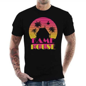 L’esthétique délicieusement vintage de ce t-shirt Dragon Ball n’a pas pu vous échapper ! Petite maisonnette en bois nichée sur une île minuscule, le repère de Tortue Géniale est un véritable havre de paix, au sein duquel on se verrait bien passer quelques vacances ! Kamé House, qui signifie maison de la tortue, fait bien sûr référence au nom de son propriétaire, Kamé Sennin en japonais. Lieu incontournable de l’histoire, Kamé House resplendit sur ce modèle ultra classe et très années 80 dans l’âme. Idéal pour se rappeler avec style au bon souvenir du cultissime et immortel manga d’Akira Toriyama.