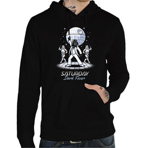 Plongez dans une galaxie disco très lointaine avec "Saturday Dark Fever", un t-shirt qui fusionne l’univers funky de Saturday Night Fever et la saga culte Star Wars. Remplaçant John Travolta, Dark Vador en costume blanc prend la pose emblématique sous une boule à facette intersidérale, flanqué de deux stormtroopers prêts à groover. L’illustration capte à merveille l’esprit des années 70, remixé à la sauce impériale. Parfait pour les fans de sabres lasers, de dancefloor, et d’humour rétro. Un must-have pour ceux qui aiment quand la Force rencontre le funk !