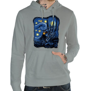 Quand la Terre du Milieu rencontre l’impressionnisme ! Ce design unique revisite l’univers de Sauron à la manière de Van Gogh, inspiré de la célèbre Nuit étoilée. En premier plan, l’imposant Sauron domine la scène, tandis qu’en arrière-plan, le Mordor s’étend sous un ciel tourbillonnant et vibrant de couleurs. Le volcan en éruption projette ses flammes dans l’atmosphère tourmentée, créant un contraste saisissant entre la lumière et les ténèbres. Un t-shirt parfait pour les fans de Le Seigneur des Anneaux et d’art, mêlant la puissance du mal et l’esthétique envoûtante de la peinture impressionniste