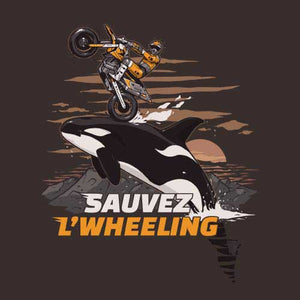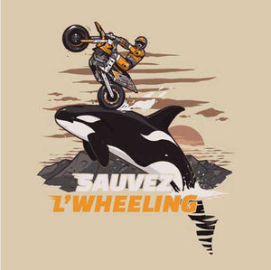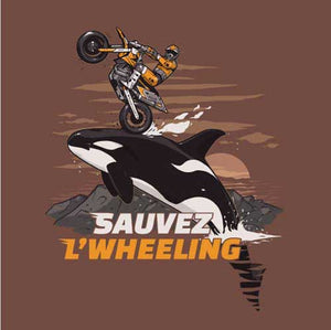 Chez Checkpoint on est toujours friands de jeux de mots débiles, et en voici un dont on est particulièrement fiers : Sauvez l’wheeling ! Vous ne rêvez pas, il s’agit bien d’une rencontre 100% improbable entre le film américain tout mimi des années 90 et la figure acrobatique pour casse-cou des deux roues. Un tee-shirt bien WTF alliant nostalgie et humour, et donc complètement indispensable, surtout pour faire marrer vos potes motards.