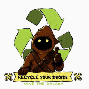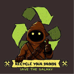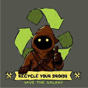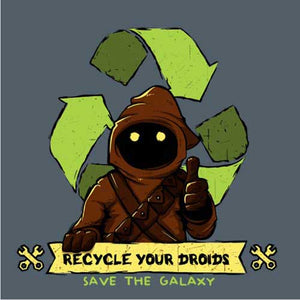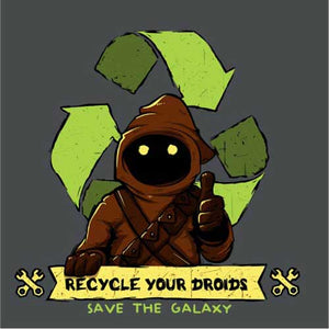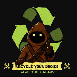 Voilà un tee-shirt aussi humoristique qu’engagé : Sauvez la galaxie et recyclez votre droïde ! Les habitants de Tatooine n’ont pas tous la fibre du bricolage, alors quand un droïde tombe en panne, il finit bien souvent à la décharge ! Heureusement, ces braves jawas, qui sillonnent le désert dans leur immense char des sables, ont entrepris de les récupérer pour les recycler ! Bon, avant de le leur confier, mieux vaut faire attention à ne pas laisser un message à l’intérieur… Un tshirt Star Wars geek et écolo, pour montrer avec humour votre amour de notre belle planète.