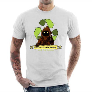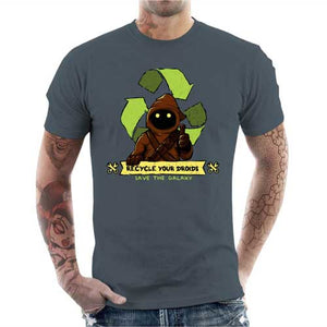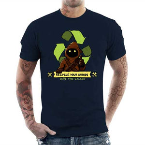 Voilà un tee-shirt aussi humoristique qu’engagé : Sauvez la galaxie et recyclez votre droïde ! Les habitants de Tatooine n’ont pas tous la fibre du bricolage, alors quand un droïde tombe en panne, il finit bien souvent à la décharge ! Heureusement, ces braves jawas, qui sillonnent le désert dans leur immense char des sables, ont entrepris de les récupérer pour les recycler ! Bon, avant de le leur confier, mieux vaut faire attention à ne pas laisser un message à l’intérieur… Un tshirt Star Wars geek et écolo, pour montrer avec humour votre amour de notre belle planète.
