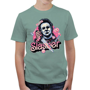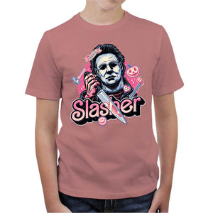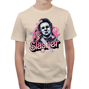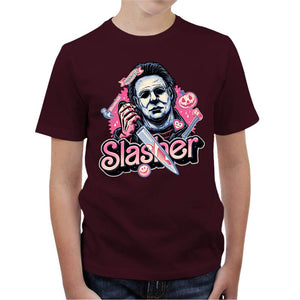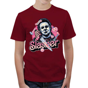 Ce t-shirt unique mélange l'univers du film d'horreur Halloween avec l'esthétique rose et glamour de Barbie pour un effet à la fois terrifiant et décalé. Mike Myers, avec son couteau emblématique, apparaît dans un style Barbie, entouré de couleurs vives et flashy qui tranchent avec sa nature sinistre. Le mot "Slasher" est écrit en gros pour affirmer fièrement l'amour du genre. Ce t-shirt est parfait pour les fans de films d'horreur qui aiment aussi l'humour et l'ironie. Un design qui allie l'effrayant et le fun, pour un look vraiment unique et provocateur !