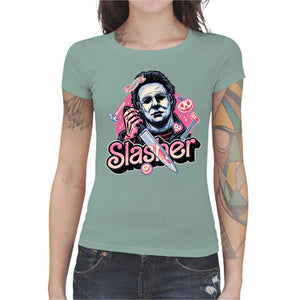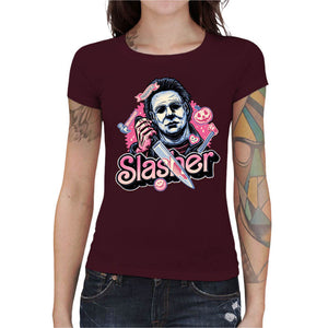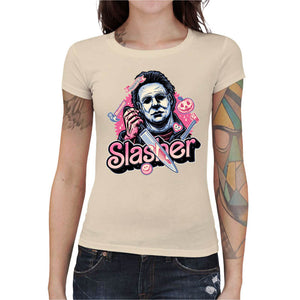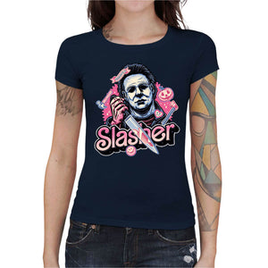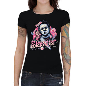 Ce t-shirt unique mélange l'univers du film d'horreur Halloween avec l'esthétique rose et glamour de Barbie pour un effet à la fois terrifiant et décalé. Mike Myers, avec son couteau emblématique, apparaît dans un style Barbie, entouré de couleurs vives et flashy qui tranchent avec sa nature sinistre. Le mot "Slasher" est écrit en gros pour affirmer fièrement l'amour du genre. Ce t-shirt est parfait pour les fans de films d'horreur qui aiment aussi l'humour et l'ironie. Un design qui allie l'effrayant et le fun, pour un look vraiment unique et provocateur !