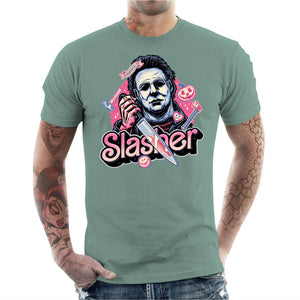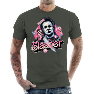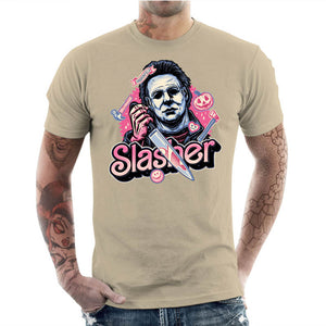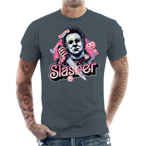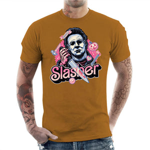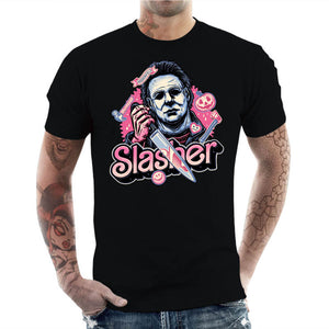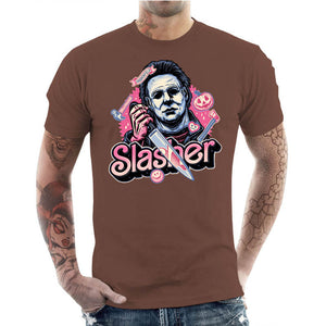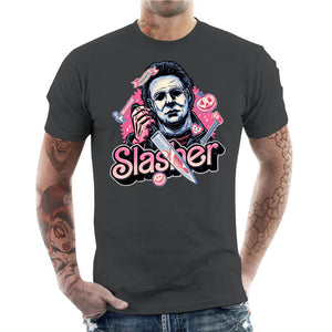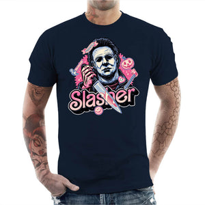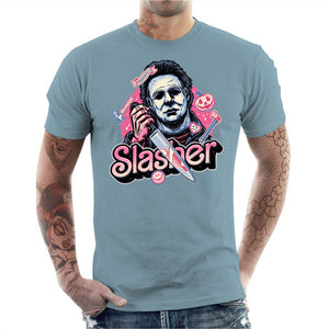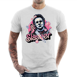 Ce t-shirt unique mélange l'univers du film d'horreur Halloween avec l'esthétique rose et glamour de Barbie pour un effet à la fois terrifiant et décalé. Mike Myers, avec son couteau emblématique, apparaît dans un style Barbie, entouré de couleurs vives et flashy qui tranchent avec sa nature sinistre. Le mot "Slasher" est écrit en gros pour affirmer fièrement l'amour du genre. Ce t-shirt est parfait pour les fans de films d'horreur qui aiment aussi l'humour et l'ironie. Un design qui allie l'effrayant et le fun, pour un look vraiment unique et provocateur !