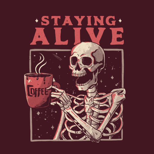 Staying Alive met en scène un squelette étonnamment joyeux qui tend une tasse de café, comme une invitation à survivre à la journée avec humour. Le contraste entre la figure macabre et son attitude chaleureuse crée un visuel à la fois drôle et décalé. Le titre “Staying Alive” inscrit en haut de l’illustration renforce l’idée que le café est parfois la seule énergie capable de nous maintenir debout. Cette scène minimaliste et expressive parle à tous ceux qui affrontent le quotidien avec ironie et autodérision. Un design pop et universel, parfait pour les amateurs d’humour noir, de café et de visuels iconiques.