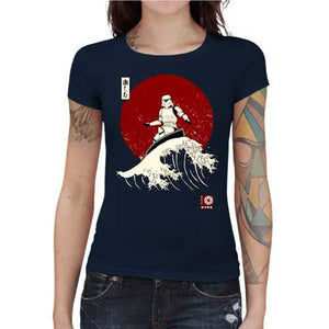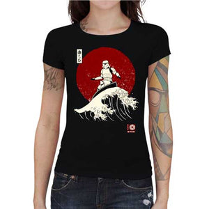 La coolitude de ce tee-shirt Star Wars n’a pas pu vous échapper ! Reconnaissables entre mille, les stormtroopers figurent parmi les personnages emblématiques de la légendaire saga. Pas très malins, cibles faciles et piètres tireurs, les soldats de l’Empire sont toujours envoyés au casse-pipe, et n’ont pas forcément un rôle très enviable. Mais on les aime quand même ! Fidèle à nos valeurs de créer des t-shirts originaux et délirants, on vous propose ce modèle incroyable d’un stormtrooper surfant la Grande Vague de Kanagawa, estampe iconique de la culture japonaise. Classe et décalé, c’est le coup de cœur assuré !