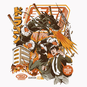 Préparez-vous à une attaque gourmande ! Le t-shirt "Sushi Dragon Attack" met en scène un dragon de feu composé de makis et de baguettes japonaises, déchaîné sur une ville rétro des années 80. La Tokyo Tower est brisée, les habitants paniquent, et les flammes (de wasabi ?) embrasent l’horizon. Un hommage explosif aux films de kaiju japonais mêlé à une passion pour la cuisine nippone. Drôle, stylé, apocalyptique et savoureux : ce design est un must-have pour les fans de culture pop, de monstres géants… et de maki.