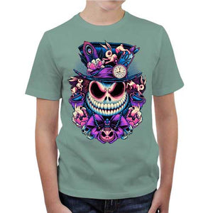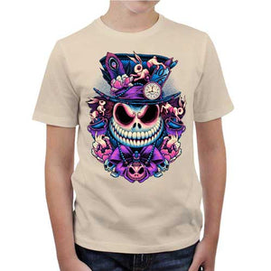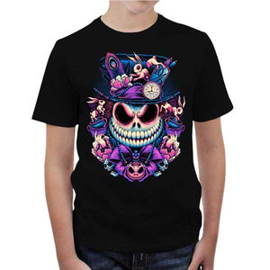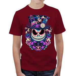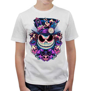 Voilà un improbable, mais irrésistible crossover que l’on vous propose à travers ce magnifique t-shirt ! Celui de deux chefs-d'œuvres de l’histoire de l’animation: Alice au pays des merveilles de Walt Disney, et l’Etrange Noël de Monsieur Jack, écrit par Tim Burton ! Deux films qui partagent des points communs, au premier rang desquels figure bien sûr leur univers sombre et débordant de personnalité. Pour incarner cette rencontre, nous avons choisi le très squelettique Jack Skellington, habillé pour l’occasion comme le très timbré Chapelier fou. Deux personnages mythiques, pour un tee-shirt débordant de détails et de style !