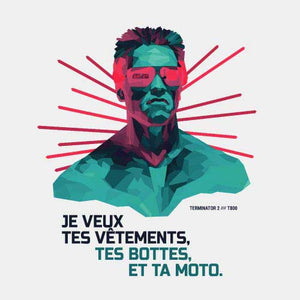 Le problème des voyages dans le temps de Terminator, c’est qu’on arrive nu comme un ver ! Alors pas le choix pour le très sympathique T-800, qui doit à chaque fois trouver un volontaire pour lui emprunter ses affaires, avec plus ou moins de délicatesse… Une réplique culte de Terminator 2, transposée ici sur un tee-shirt furieusement classe !