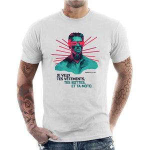 Le problème des voyages dans le temps de Terminator, c’est qu’on arrive nu comme un ver ! Alors pas le choix pour le très sympathique T-800, qui doit à chaque fois trouver un volontaire pour lui emprunter ses affaires, avec plus ou moins de délicatesse… Une réplique culte de Terminator 2, transposée ici sur un tee-shirt furieusement classe !