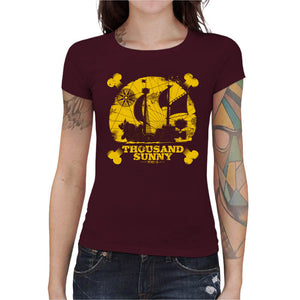 Embarquez à bord du Thousand Sunny, le légendaire navire de l’équipage du Chapeau de Paille ! Cette illustration monochrome met en scène le célèbre bateau de Luffy, toutes voiles déployées, fendant les mers sans peur. Le design s’inscrit dans une silhouette rappelant l’emblème pirate des Mugiwara : une tête de mort stylisée avec os croisés. Minimaliste mais percutant, ce t-shirt capture l’essence de l’aventure One Piece : liberté, camaraderie et exploration infinie. Un must-have pour tout fan du manga et de l’anime, parfait pour afficher son esprit de pirate sans renoncer au style.