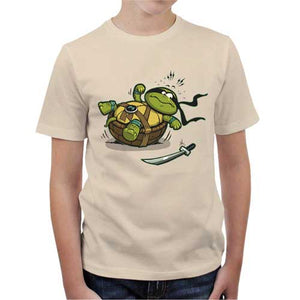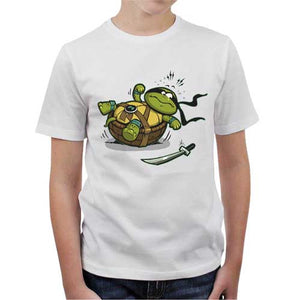Imaginez que les redoutables Tortues Ninja, maîtres dans l’art du ninjutsu, et plutôt baraquées dans leur genre, redeviennent les inoffensifs petits reptiles qu’elles étaient avant de muter ! C’est visiblement ce qui est arrivé au pauvre Leonardo, tombé dans le pire piège possible pour une tortue: se retourner sur le dos ! Shredder peut dormir sur ses deux oreilles… Un adorable tee-shirt pour les fans de la bande à Splinter !